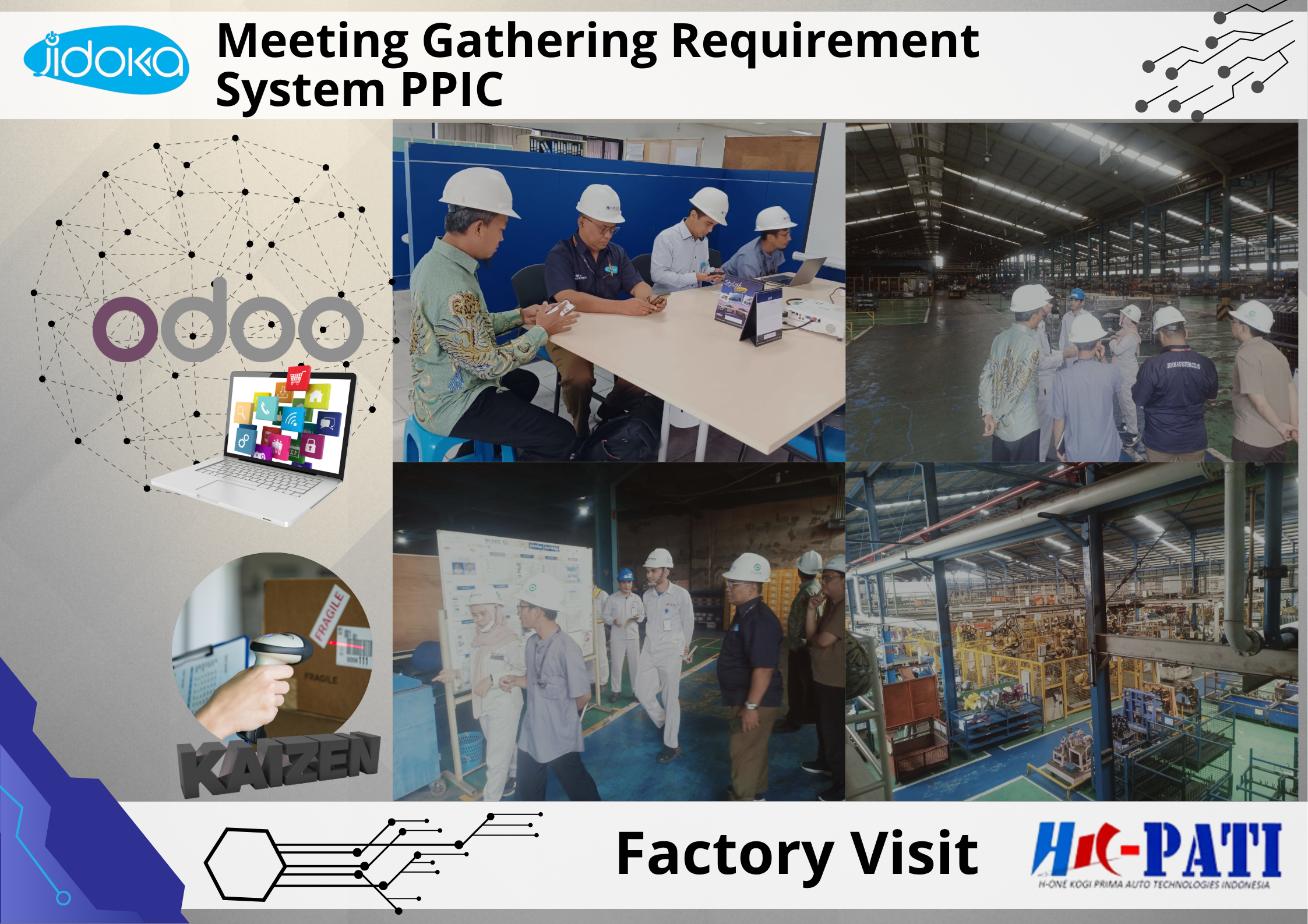 Tim PT Jidoka System Indonesia melakukan kunjungan ke pabrik PT HK Pati yang berlokasi di Karawang. Kegiatan ini bertujuan untuk melakukan gathering requirement sebagai langkah awal dalam implementasi sistem ERP Odoo di lingkungan PT HK Pati.