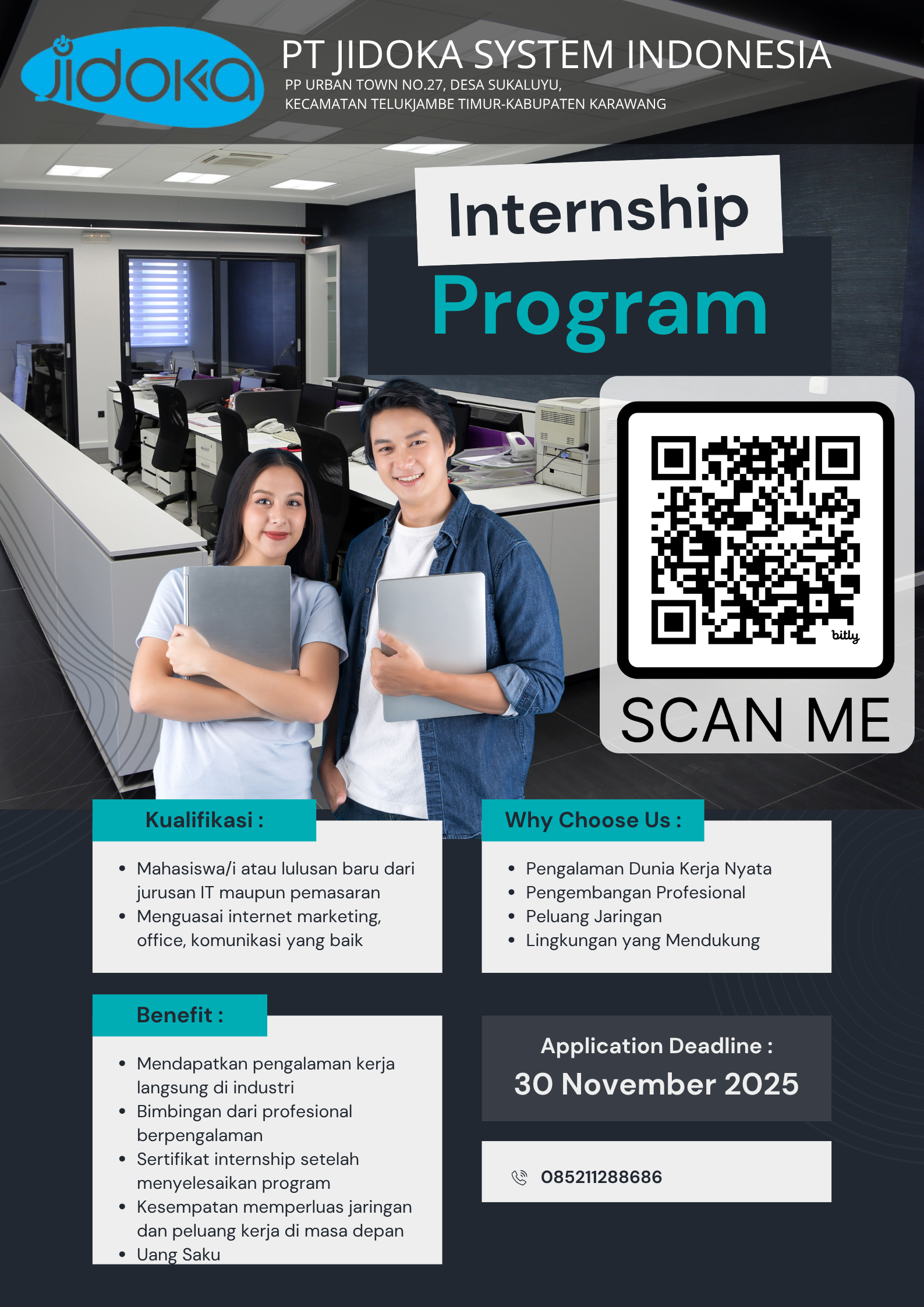 Kami membuka kesempatan bagi mahasiswa/i atau lulusan baru untuk bergabung sebagai Intern di PT Jidoka System Indonesia. Program internship ini dirancang untuk memberikan pengalaman nyata di bidang pemasaran software aplikasi dan meningkatkan keterampilan profesional Anda.